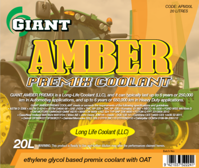 GIANT RED PREMIX is formulated to absorb and remove excess heat from the engine block to the radiator so as to prevent overheating, and ensuring that the engine operates at its optimally efficient temperatures. The Anti-Freeze properties are also ideal for freeze protection when required at temperatures below freezing point.